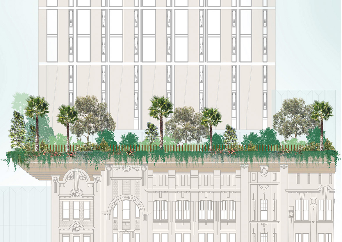 The design for this 59-storey development delicately integrates with the site’s existing heritage Edwardian facades. An innovative, architecturally designed landscape vessel podium, wrapped in sandstone veneer was envisioned to support a deep planting environment. This creates an elevated, Level 4 landscape retreat, offering a world-class restorative experience for guests and residents in the heart of the city.