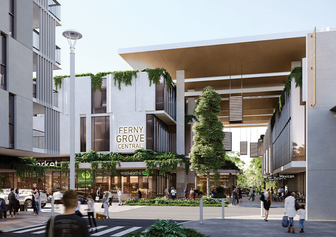 In collaboration with Bureau Proberts Architects, what was once a commuter car park has been reimagined into a thriving mixed-use destination. The design integrates residential living with 12,000sqm of retail, dining, childcare, and recreational facilities. Generous roof terraces and shaded, walkable streets connect people to place, enhancing access to the Ferny Grove train and bus interchange with approximately 1,400 commuter parks, about 900 of which are undercover.