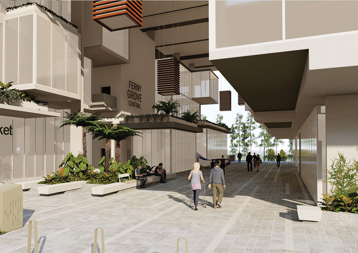 The vision delivers exceptional subtropical design through a human-scaled public realm. A lush environment reminiscent of the surrounding bushland has been curated by using local endemic species, select exotics, and large specimen trees for instant impact. This creates generous and inviting outdoor spaces that will become the heart of the Ferny Grove community for years to come.