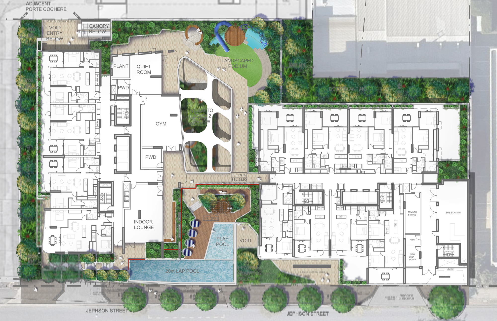 The design centres on an internal plaza and public realm that introduce a human scale to the surrounding streetscape. Layered podium landscapes cultivate a rich mix of spaces for outdoor living and entertainment, which collectively enhance the liveability of the residential environment. This best-practice approach is responsive to the distinct needs of public areas, private zones, and the overall precinct, resulting in a cohesive and adaptable urban landscape.